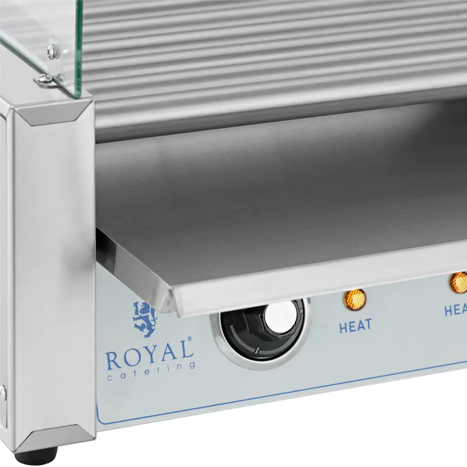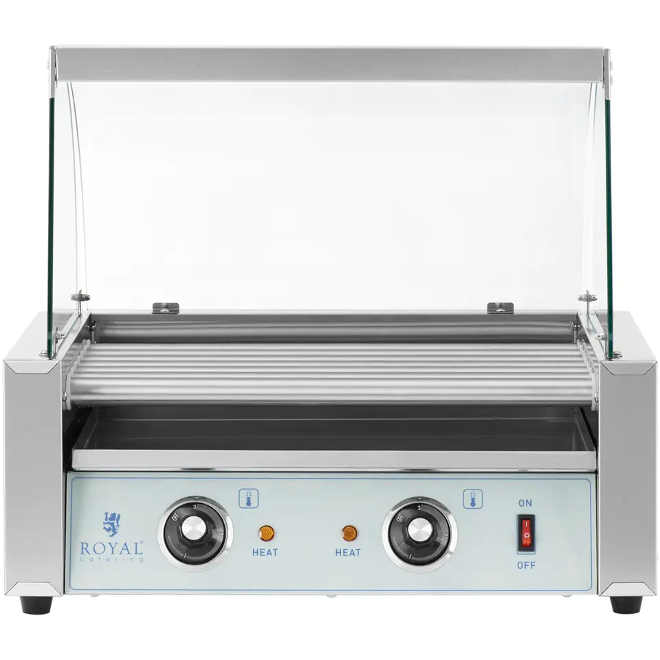 Grill rolkowy marki Royal Catering stworzony został do smażenia i utrzymywania w cieple kiełbasek. Sprawdzi się w punktach gastronomicznych, na stacjach benzynowych czy w food truckach. 7 mocnych rolek grzewczych zapewnia szybkie przygotowanie do 12 parówek. Wałki zostały pokryte stalą nierdzewną, obracają się o 360° i równomiernie podgrzewają parówki. Temperatura regulowana jest w między 0-230°C. Dwie strefy grzewcze znajdują się z przodu i z tyłu urządzenia. Sterowane są oddzielnymi termostatami, co pozwala smażyć kiełbaski i utrzymywać je w cieple. Tacka ociekowa zbiera nadmiar tłuszczu. Przełącznik służy do włączania i wyłączania urządzenia. Lampki sygnalizujące informują o osiągniętej temperaturze. Grill wykonany został ze stali nierdzewnej, jest odporny na korozję i uszkodzenia mechaniczne. Osłona z hartowanego szkła chroni żywność przed zabrudzeniem.