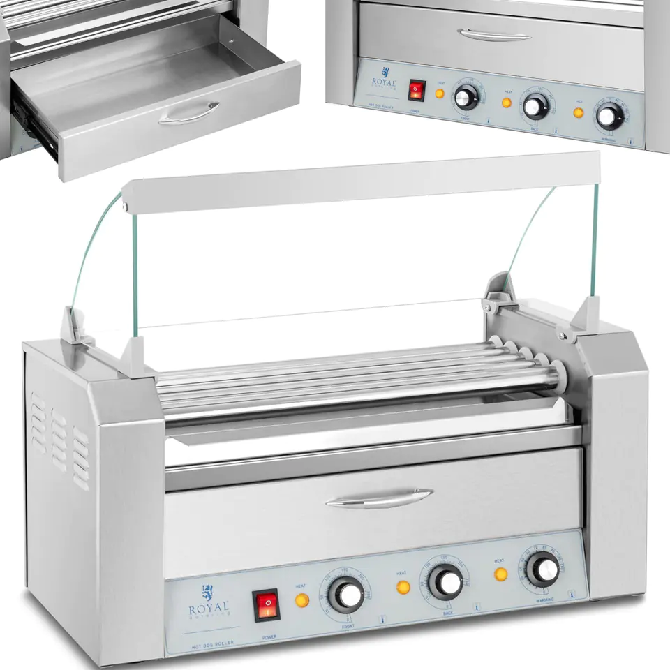Kod producenta: 10011691Grill rolkowy marki Royal Catering sprawdzi się w barach, bufetach, stacjach benzynowych czy na imprezach plenerowych. Pozwala przygotować jednocześnie 8 parówek do hot-dogów, frankfurterek, kabanosów czy kiełbasek do tortilli. Równomierne obroty o 360deg; sprawiają, że wędlina będzie jednakowo zarumieniona z każdej strony. Wytopiony tłuszcz zbiera się w tacy, którą łatwo wyjąć i umyć. Szuflada grzewcza zapewnia podgrzanie bułek w temperaturze od 30 do 110deg;C. Dwie strefy grzewcze umożliwiają niezależne ustawienie temperatury. Parówki mogą się grillować lub być tylko podgrzewane. Temperatura jest regulowana jest w zakresie 30-250deg;C. Pokrywa z hartowanego szkła chroni żywność przed zanieczyszczeniami i pozwala przyrządzać kiełbaski na oczach klientów.Cechy produktu: