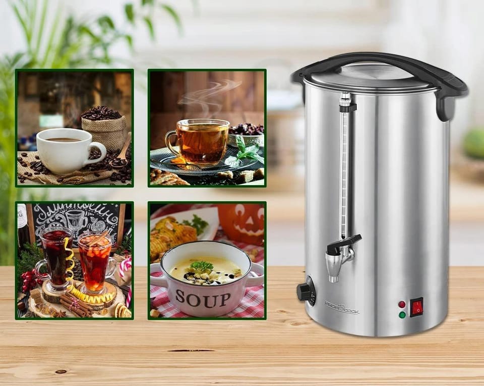 NAJWYŻSZEJ JAKOŚCIPODGRZEWACZ DO WODYWARNIKRENOMOWANEJ FIRMY PROFICOOKMODEL: PC-HGA 1111Profesjonalny warnik do wody ze stali nierdzewnej o pojemności 16 litrów. Urządzenie świetnie sprawdzi się w hotelach, restauracjach, kawiarniach, barach, stołówkach oraz firmach cateringowych.Urządzenie przeznaczone jest do szybkiego gotowania i utrzymania temperatury większej ilości wody przeznaczonej do przyrządzania napojów. Może służyć również jako podgrzewacz wina oraz soku.Wysokiej jakości, profesjonalny warnik do wody ProfiCook PC-HGA 1111 z pojemnikiem oraz pokrywką wykonanymi ze stali nierdzewnej to urządzenie które świetnie sprawdzi się w hotelach, restauracjach, kawiarniach, barach, stołówkach oraz firmach cateringowych.Przeznaczony jest do szybkiego gotowania aż 16 litrów wody przeznaczonej do przyrządzania napojów - może służyć również jako podgrzewacz wina oraz soku. Wykonany jest z wysokiej jakości stali nierdzewnej a jego elegancki wygląd nie zaburzy estetycznego ustawienia potraw i napojów na stole.Warnik wyposażony jest w wysokiej jakości 1500 W grzałkę która pozwoli na szybkie zagotowanie zawartości. Grzałka znajduje się pod dnem warnika - zaletą tego rozwiązania jest brak kontaktu grzałki z płynem, dzięki czemu nie tworzy się na niej kamień, który z czasem może doprowadzić do przegrzania i do awarii.Kolejną istotną zaletą jest możliwość łatwego czyszczenia pojemnika i odkamieniania. Zabezpieczenie przeciw przegrzaniu oraz pracy na sucho znacznie wydłużają żywotność urządzenia.ProfiCook PC-HGA 1196 posiada regulację zakresu temperatury w przedziale 30-100°C. Natomiast wbudowana lampka kontrola sygnalizuje grzanie wody. Włącznik pozwala natomiast wyłączyć urządzenie bez konieczności odłączania wtyczki z sieci.Najważniejsze cechy warnika ProfiCook PC-HGA 1111:Zamykany, bezpieczny pojemnik ze stali nierdzewnejMoc 1500 WPojemność zbiornika 16 litrówUkryty element grzewczy ze stali nierdzewnejPłynna regulacja temperatury (30°C-100°C)Demontowany, metalowy kranWskaźnik poziomu zewnętrznegoDemontowalny wskaźnik poziomu umożliwia łatwe czyszczenieUchwyty z tworzywa sztucznego (izolowane termicznie)Funkcja utrzymywania ciepła2 lampki kontrolnePrzełącznik włącz / wyłączZabezpieczenie przed przegrzaniem Wymiary warnika:Wymiary: (ok. szer. x wys. x gł.) i wagaUrządzenie: 340 x 470 x 335 mm; 2.43 kgOpakowanie: 320 x 495 x 320 mm; 2.56 kg Produkt został odznaczony certyfikatem FOCUS - TEST DEUTSCHLANDS BESTECertyfikat TEST DEUTSCHLANDS BESTE został przyznany na podstawie badań przeprowadzonych przez „Germanys best household electronics”. W ramach testu porównane zostały produkty z ponad 20 000 marek z 274 segmentów rynkowych.Celem wyróżnienia „Focus” jest wskazywanie produktów cieszących się największym uznaniem konsumentów. Certyfikat przyznany jest na podstawie badań niemieckiego rynku i potwierdza wysoką jakość produktów a także świadczy o dużym zaufaniu konsumentów i renomie marki.slimtex