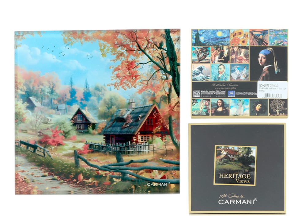Gustowna, kwadratowa podkładka szklana pod kubek przedstawia malownicze sceny z życia dawnej wsi ? drewniane chaty kryte strzechą, złote łany zbóż, studnie, drewniane płoty oraz codzienne życie gospodarzy i zwierząt.