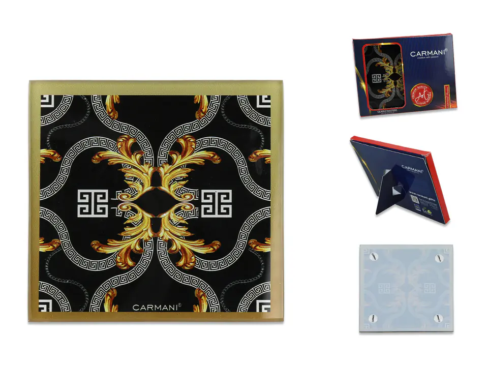 Gustowna, kwadratowa podkładka pod kubek ozdobiona oryginalnymi wzorami z dużą ilością złota.