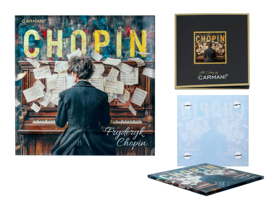 Gustowna, kwadratowa podkładka pod kubek, która wyróżnia się oryginalnym zdobieniem inspirowanym twórczością Fryderyka Chopina.