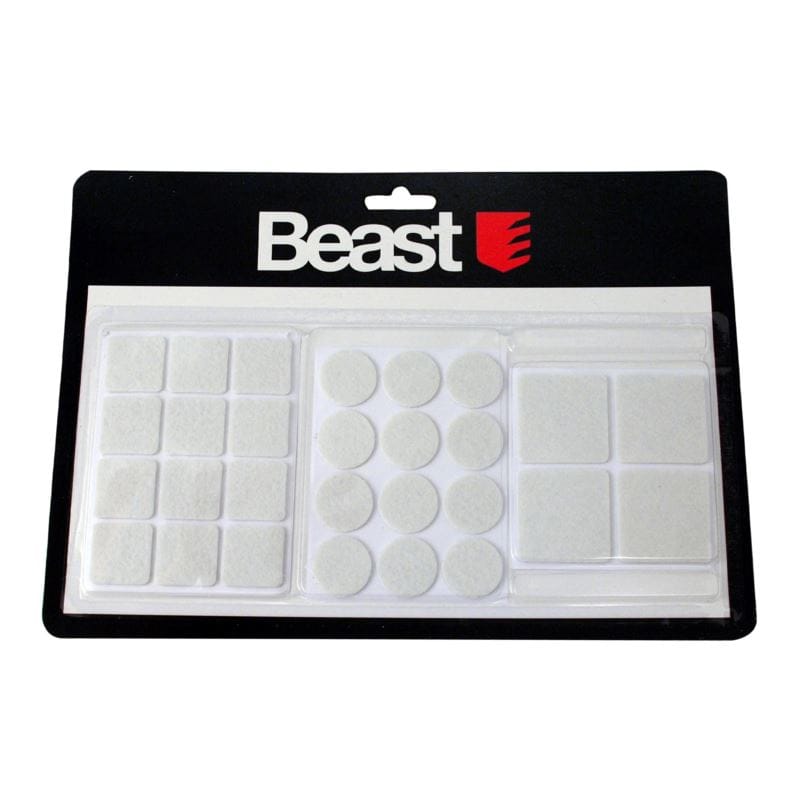 Zestaw samoprzylepnych podkładek filcowych pod meble, 28 sztuk, w kolorze białym, obejmuje zarówno kwadratowe, jak i okrągłe kształty, co zapewnia uniwersalność zastosowania.