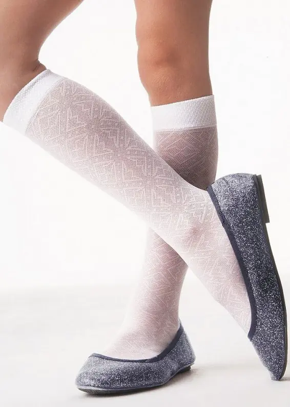 Podkolanówki dziecięce żakardowe wykonane z przędzy typu elastan. Grubość 20 den. Pakowane po dwie pary. Skład: 92% poliamid, 8% elastan.