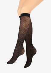 Stylowe podkolanówki żakardowe wykonane z wysokiej jakości przędzy o delikatnym, półtransparentnym wykończeniu. Wzór w drobne kropeczki dodaje im subtelnego uroku, idealnie komponując się zarówno z eleganckimi, jak i codziennymi stylizacjami.