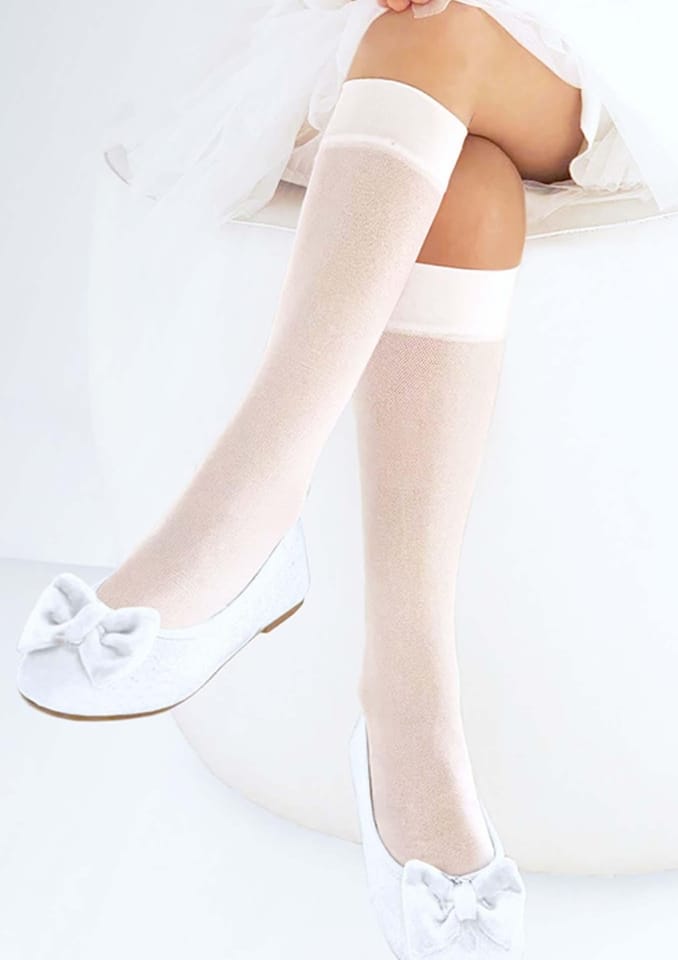 Podkolanówki dziewczęce z drobnym wzorem i szeroką gumką. Lekkie, przewiewne i wygodne, pięknie podkreślają delikatność dziecięcej stylizacji.Wykonany z wysokiej jakości przędzy o grubości 15 den. Skład: 90% poliamid, 10% elastan.