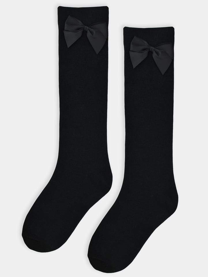 Skarpety podkolanówki dziewczęce z czarną kokardką. Skład: 72%bawełna, 25%poliamid, 3%elastan.