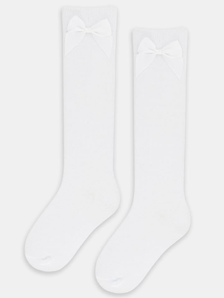 Skarpety podkolanówki dziewczęce z białą kokardką. Skład: 72%bawełna, 25%poliamid, 3%elastan.