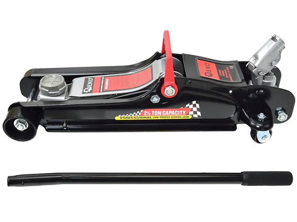 Podnośnik 2,5T Geko G02031 wykonany z grubej, walcowanej blachy stalowej, sztywny i wytrzymały. Waży 14 kg. Wyposażony w kółka, przednie metalowe oraz tylne, łożyskowane i skrętne. Posiada zawór bezpieczeństwa zintegrowany z zaworem spustowym. Nisko profilowy do używania przy samochodach o niskim zawieszeniu, sportowych oraz tuningowanych. Maksymalny udźwig tego podnośnika to 2500 kg. wysokość minimalna podniesienia: 80 mm. maksymalne podniesienie do 365 mm. Posiada obrotową o 360° główkę upraszcza ona w znaczny sposób obsługę podnośnika.