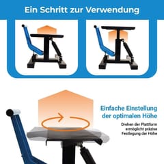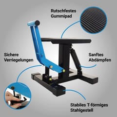 Dzięki solidnej stalowej konstrukcji oraz udźwigowi do 150 kg podnośnik jest wyjątkowo stabilny i bezpieczny. Gumowana platforma chroni ramę motocykla i zapobiega przesuwaniu nawet na zaolejonej powierzchni. Regulowany zakres wysokości od 265 do 430 mm pozwala precyzyjnie dobrać poziom roboczy.Zastosowana nożna dźwignia umożliwia łatwe unoszenie motocykla przy minimalnym wysiłku, a zintegrowany amortyzator zapewnia kontrolowane i płynne opuszczanie.