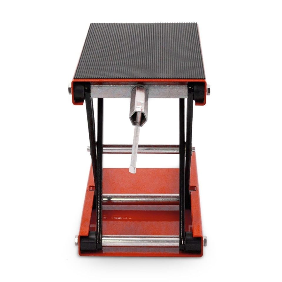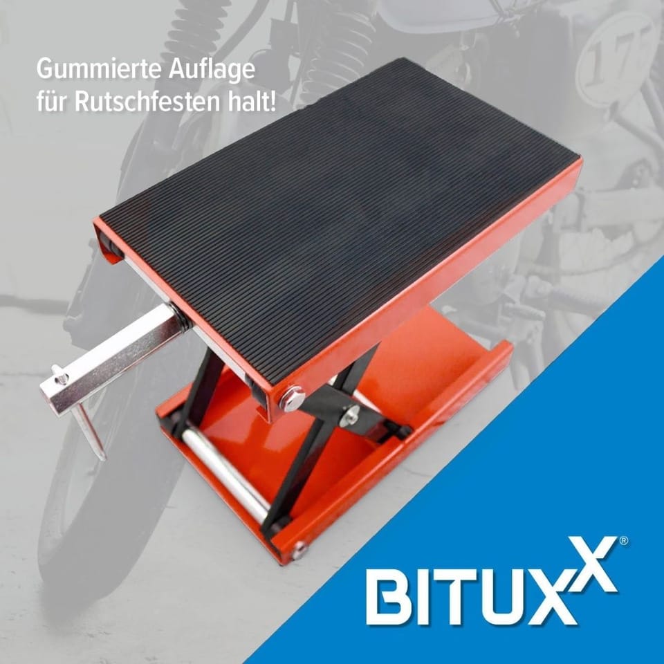 Dzięki solidnemu podnośnikowi motocyklowemu Bituxx możesz łatwo podnosić motocykle z ramami rurowymi z podwójną pętlą. Podnośnik można regulować indywidualnie za pomocą korby, grzechotki lub klucza znajdującego się na śrubie regulacyjnej.