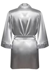 Elegancki, satynowy peniuar w pięknym, srebrnym kolorze. Krój luźny, inspirowany zgrabnym kimono, wiązany w talii paskiem, dołączonym do zestawu. Satyna o subtelnym, perłowym blasku, pięknie się prezentuje. Skład: 100% poliester.