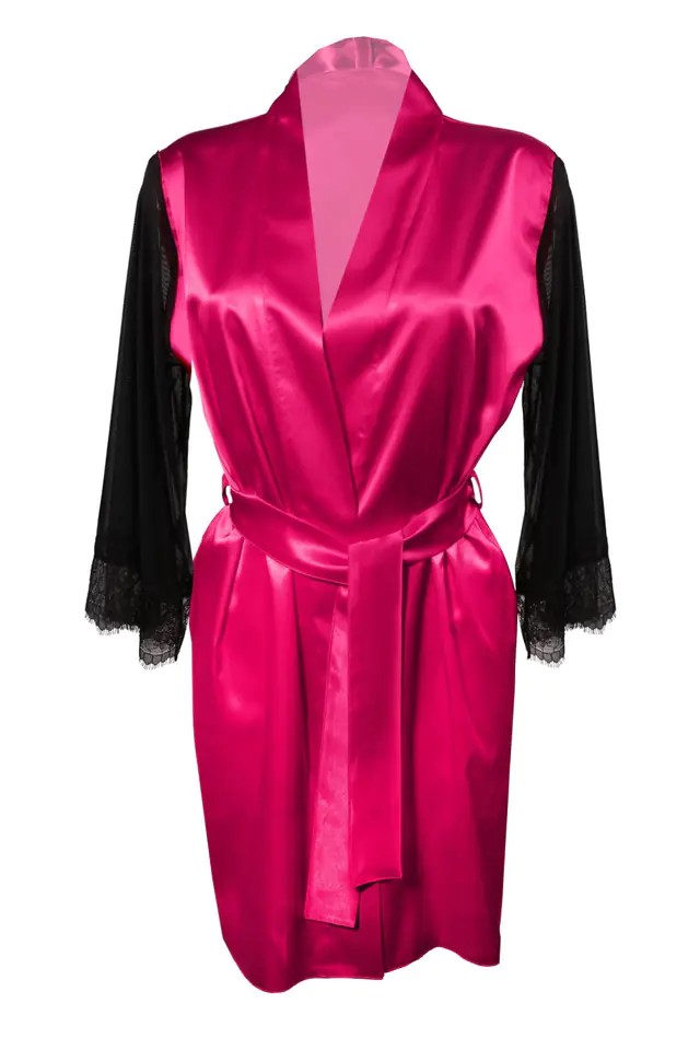 ELEGANCKI I NIEZWYKLE SEKSOWNY SZLAFROCZEK Z DELIKATNEJ SATYNY. TIULOWE RĘKAWY WYKOŃCZONE KORONKĄ, DODAJĄ MNÓSTWO PIKANTERII. PRAKTYCZNE WIĄZANIE W PASIE IDEALNIE DOPASOWUJE SIĘ DO SYLWETKI, UWYDATNIAJĄC ATUTY KOBIECEGO CIAŁA