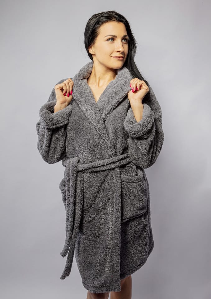 PODOMKA Z KOŁNIERZEM USZYTA Z NIEZWYKLE MIĘKKIEGO MATERIAŁU BARDZO DOBREJ JAKOŚCI. PO BOKACH DWIE KIESZENIE. RĘKAWY Z MANKIETAMI. DO SZLAFROKA JEST RÓWNIEŻ PASEK. DŁUGOŚĆ SZLAFROKA 90 CM. MATERIAŁ: DZIANINA RUNOWA TYPU LAMA.