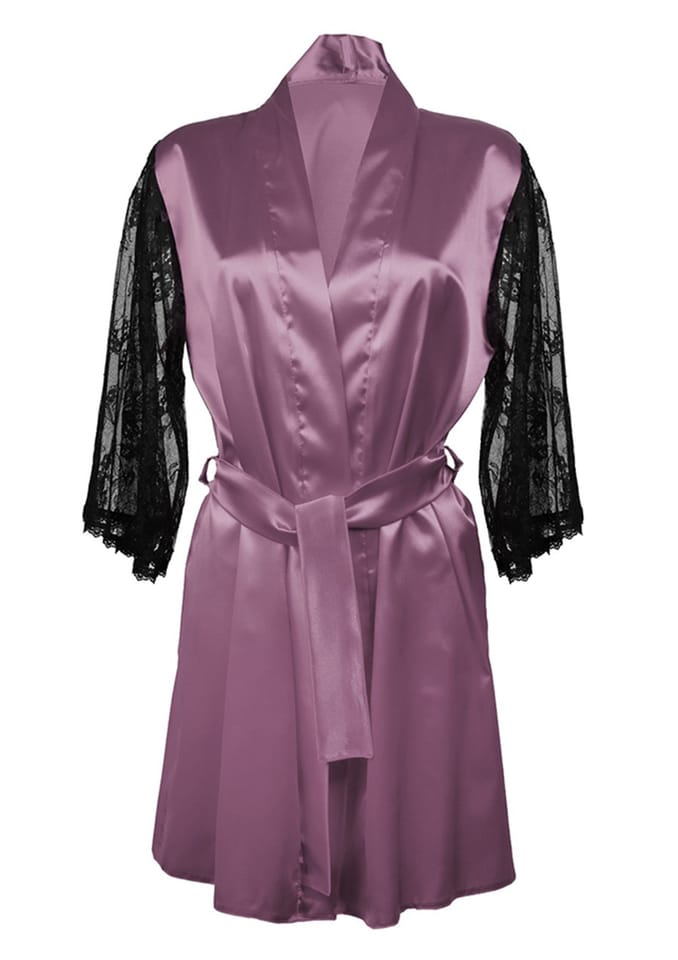 PRZYJEMNY, ELEGANCKI SATYNOWY SZLAFROK. WYKOŃCZONY DŁUGIMI RĘKAWAMI Z DELIKATNEJ KORONKI. PRZEPLATANY PASKIEM SATYNOWYM, KTÓRY IDEALNIE DOPASOWUJE SIĘ DO SYLWETKI, UWYDATNIAJĄC ATUTY KOBIECEGO CIAŁA. WERSJA KOLORYSTYCZNA: WSZYSTKIE WERSJE KOLORYSTYCZNE (CZARNA KORONKA).