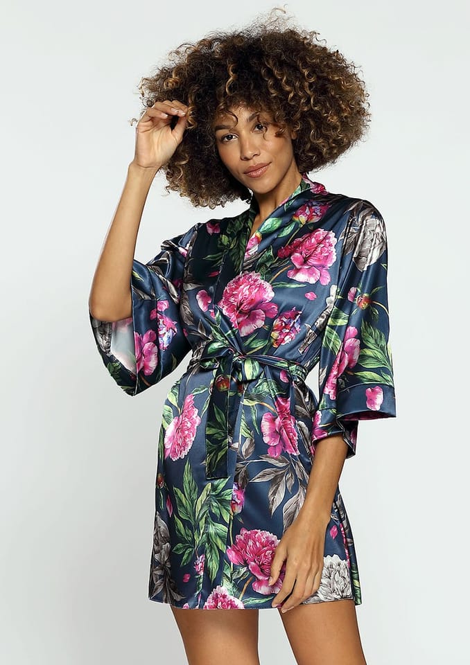 Klasyczny krótki szlafrok uszyty z zwiewnej, drukowanej satyny. Rękawy kimonowe. Po bokach dwie szlufki oraz dołączony do podomki pasek, z którego możesz stworzyć przepiękną kokardę, podkreślając Twój wdzięki oraz urok osobisty. Dostępna w 11 wzorach. Pozwól sobie na otulenie się jedwabistym dotykiem satyny.