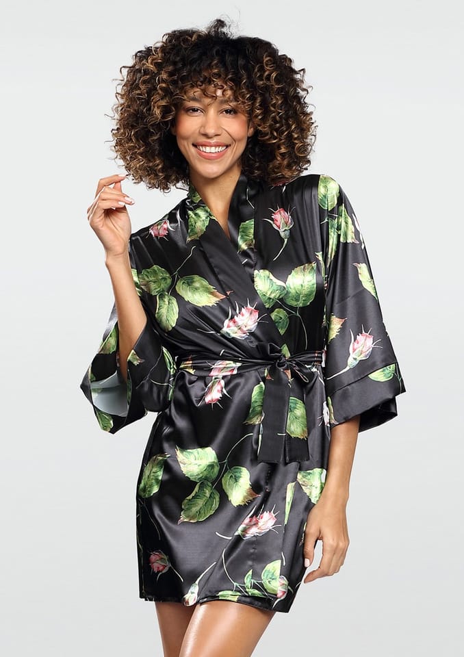 Klasyczny krótki szlafrok uszyty z zwiewnej, drukowanej satyny. Rękawy kimonowe. Po bokach dwie szlufki oraz dołączony do podomki pasek, z którego możesz stworzyć przepiękną kokardę, podkreślając Twój wdzięki oraz urok osobisty. Dostępna w 11 wzorach. Pozwól sobie na otulenie się jedwabistym dotykiem satyny.