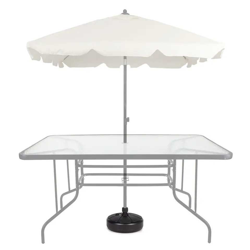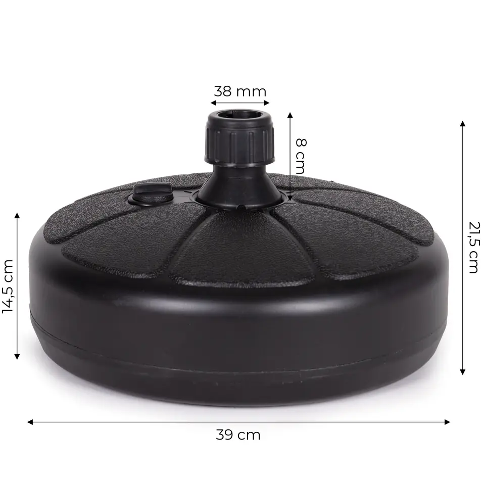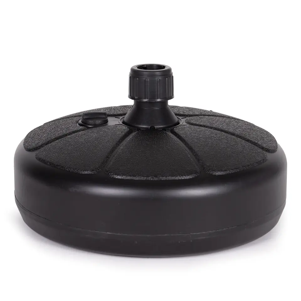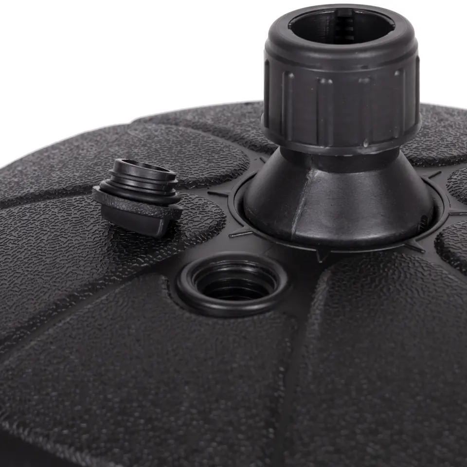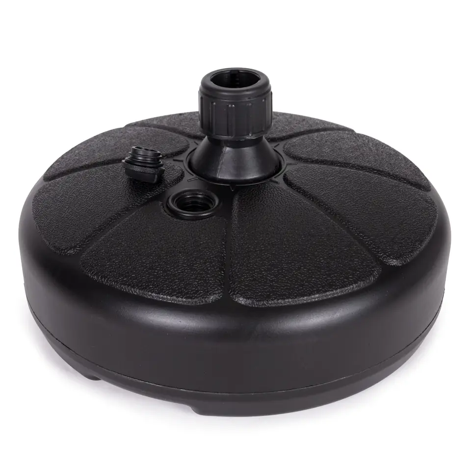 W górnej części podstawy znajduje się odkręcany korek, po jego wykręceniu należy napełnić podstawę wodą. Obciążenie będzie ważyć wtedy ok. 13 kg, co zapewni idealną stabilizację parasola.