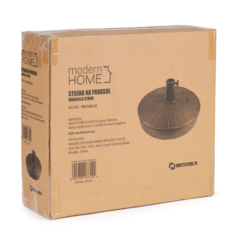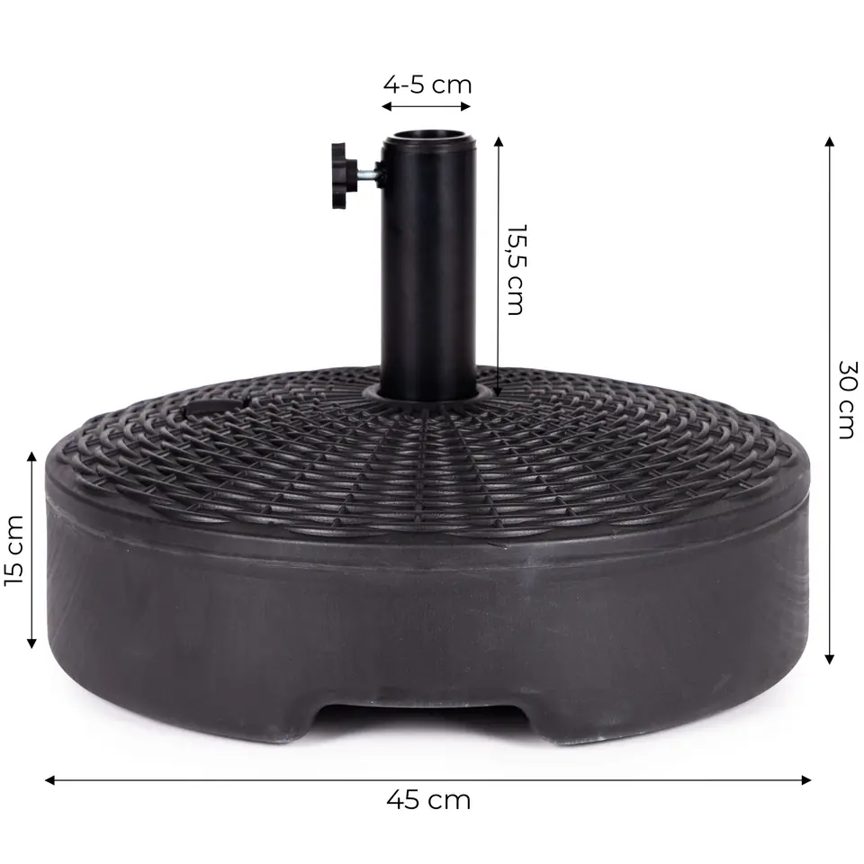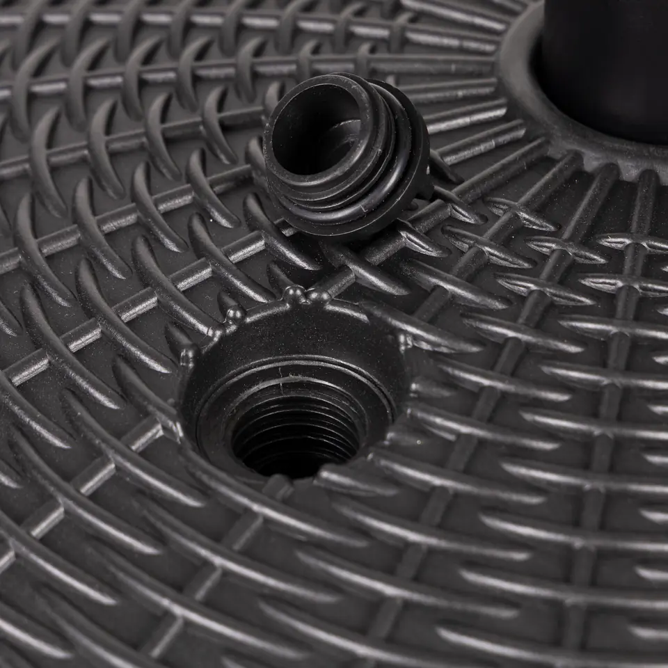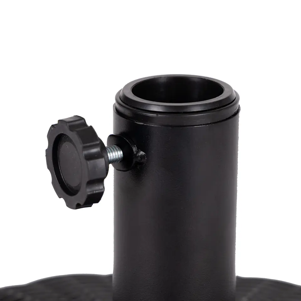 W górnej części podstawy znajduje się odkręcany korek, po jego wykręceniu należy napełnić podstawę wodą. Obciążenie będzie ważyć wtedy ok. 22 kg, co zapewni idealną stabilizację parasola.