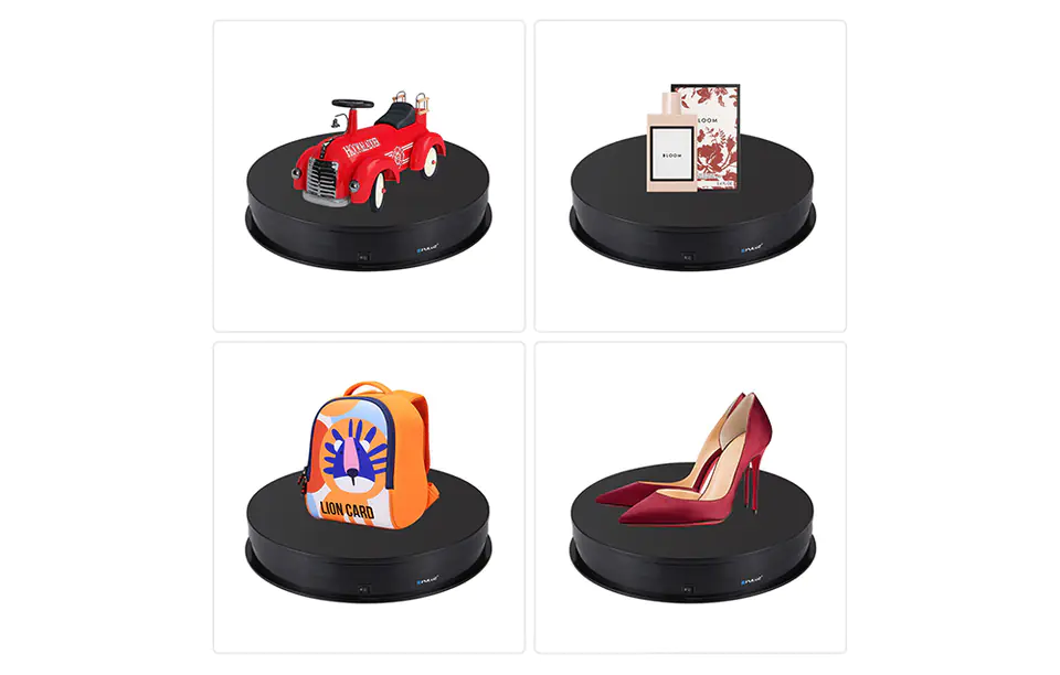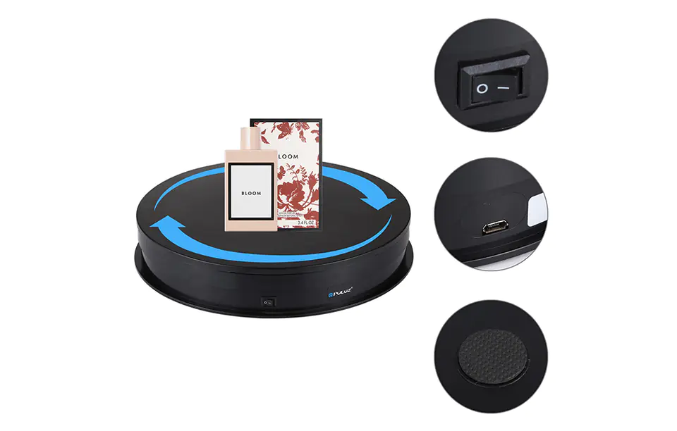 Potrzebujesz podstawki, która pozwoli Ci profesjonalnie zaprezentować biżuterię, zegarki, torebki, czy też kolekcję figurek? Obrotowa podstawka Puluz o średnicy 30 cm doskonale sprawdzi się zarówno w domu, jak i w sklepie czy studiu fotograficznym. Urządzenie obraca się o 360° i wyposażone zostało w jeden przycisk, który umożliwia wygodną obsługę. Do zestawu dołączono kabel micro USB, który umożliwi Ci podłączenie podstawki do kompatybilnego urządzenia.