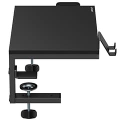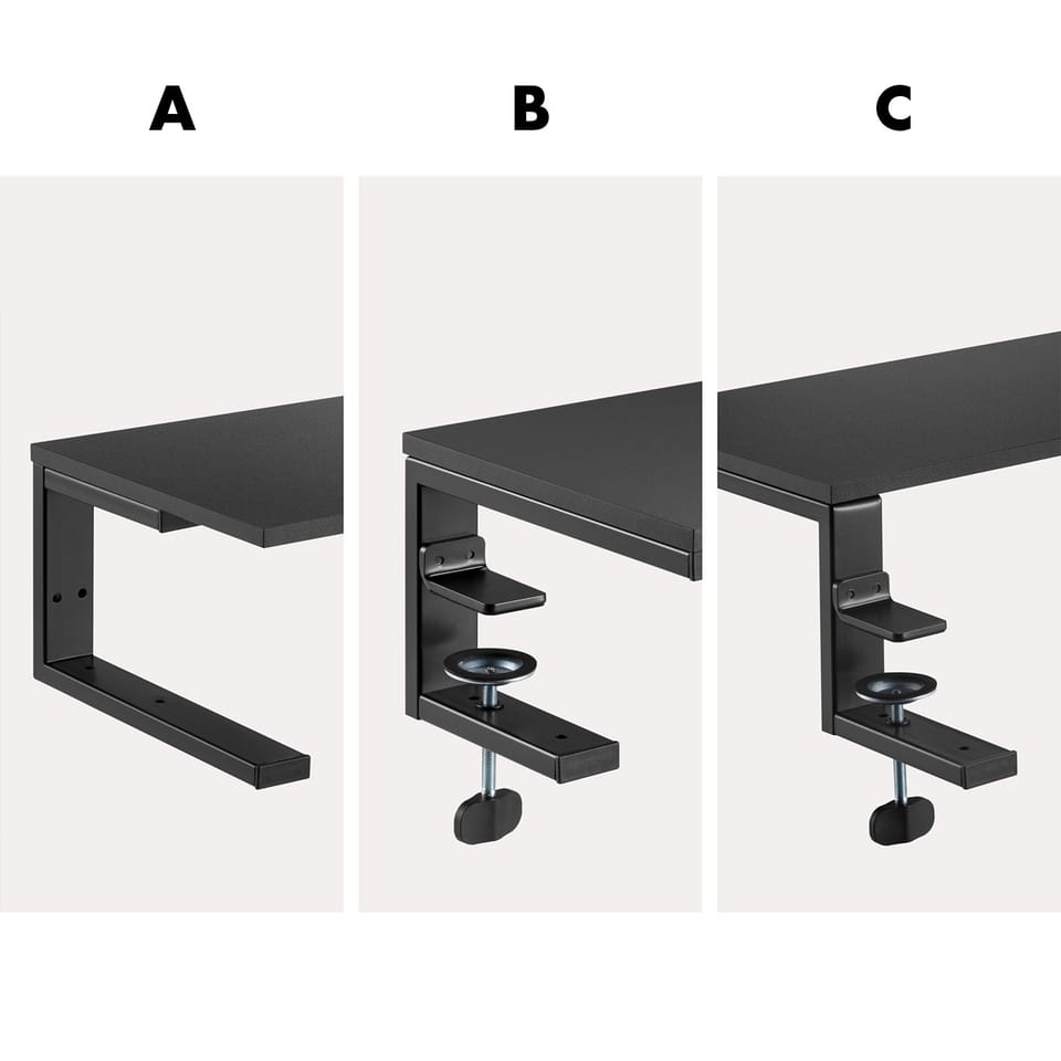 Nadstawka montowana jest do biurka za pomocą solidnych, zaciskowych uchwytów, które umożliwiają szybki i bezinwazyjny montaż bez konieczności wiercenia. Regulowane śruby dociskowe dopasowują się do różnych grubości blatów (maksymalnie 50 mm), a gumowe nakładki chronią powierzchnię przed zarysowaniami. Cała konstrukcja jest niezwykle stabilna, co daje pewność, że nawet cięższy sprzęt będzie bezpieczny w użytkowaniu.