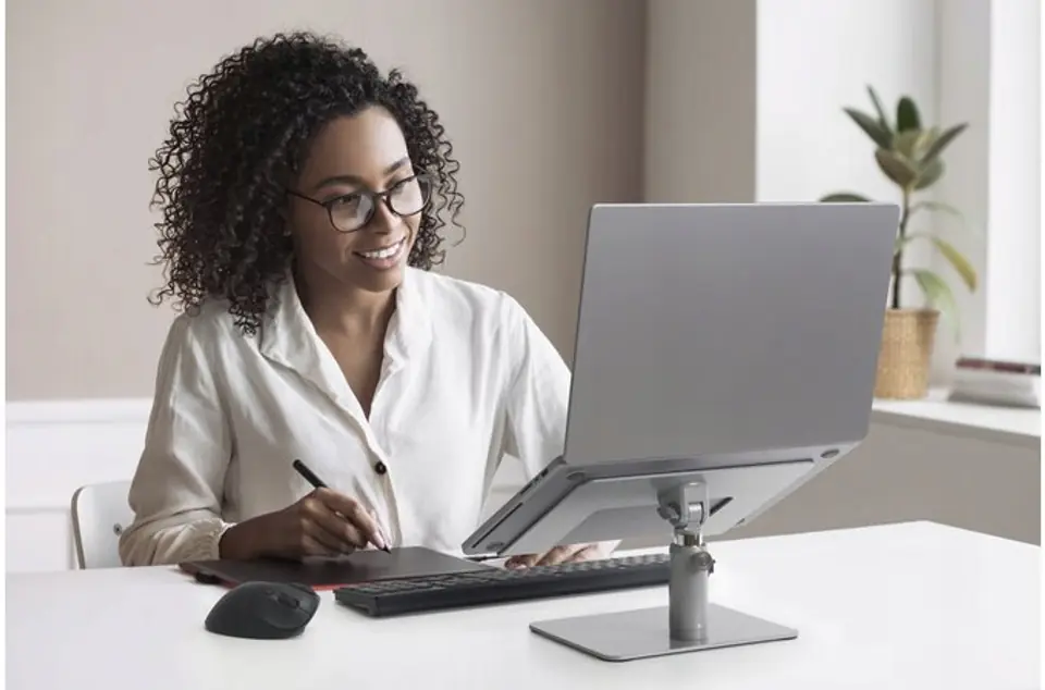 Dzieki uniwersalnej podstawce pod laptopa mozesz podnieśc ekran na wysokośc oczu , aby uzyskac optymalny kąt do patrzenia, a przy tym ograniczyc balagan na biurku.