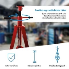 Solidna stalowa konstrukcja oraz regulacja wysokości zapewniają wysoki poziom bezpieczeństwa i komfortu pracy. Podstawki służą do stabilnego podparcia pojazdu po jego uniesieniu za pomocą podnośnika - nie są przeznaczone do samodzielnego podnoszenia auta.