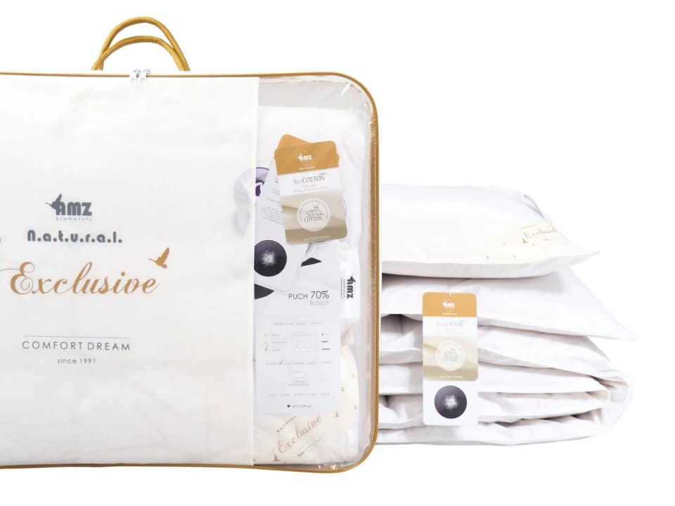 Soft Cotton, symbolizujący trwałość i komfort, to tkanina puchoszczelna o gęstym splocie, wykonana z wysokiej jakości przędzy, której wewnętrzna strona została dodatkowo wzmocniona impregnacją, zwiększającą jej szczelność. Ta miękka, przyjemna w dotyku tkanina zapewnia idealne otulenie ciała podczas snu, jednocześnie będąc lekką dzięki użyciu delikatnych nitek bawełny, co umożliwia tworzenie lżejszych produktów. Wyjątkowa przewiewność bawełny gwarantuje odpowiednią cyrkulację powietrza, zapobiegając przegrzewaniu się organizmu i regulując wilgotność poprzez uwalnianie nadmiaru wilgoci do atmosfery. Kołdry opakowane są w eleganckie torby z usztywnieniem, które nie tylko zwiększają walory estetyczne, ale także skutecznie zabezpieczają produkt podczas przechowywania i transportu, podczas gdy poduszki zapakowano w równie funkcjonale, oddychające saszetki.