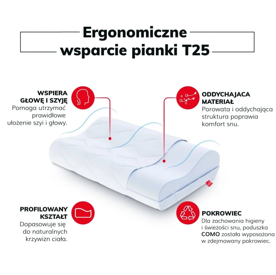 Specyfikacja poduszki COMO LIGHT : Wypełnienie - pianka poliuretanowa T25 Zdejmowany pokrowiec zapinany na zamek błyskawiczny Pokrowiec - poliester 100% Właściwości antyalergiczne Nie chłonie wilgoci Poduszka jednokomorowa Poduszka całoroczna Doskonała sprężystość Wytrzymałość na odkształcenia 2 lata gwarancji Poduszka COMO LIGHT Poduszka COMO LIGHT optymalnie dopasowuje się do kształtu ciała, dzięki specjalnemu profilowi (dwie wysokości), który pozwala na korzystanie z niej niezależnie od sposobu spania. Wkład wykonano ze specjalnej przewiewnej, elastycznej i sprężystej pianki poliuretanowej T25, zapewniając idealne podparcie głowy i karku. Polecana szczególnie osobom, które chcą budzić się bez bólu karku. Doceni je każdy, kto zmaga się z dolegliwościami barków czy kręgosłupa. Pokrowiec tej poduszki został wykonany z miękkiej i wytrzymałej tkaniny, delikatnej w dotyku i dobrze przepuszczającej powietrze. Przyjazna dla dzieci i dla alergików Poduszka COMO LIGHT to ergonomiczne rozwiązanie dla osób budzących się z bólem karku i barków. Dzięki wyprofilowanej konstrukcji i elastycznej piance T25 idealnie dopasowuje się do kształtu ciała, zapewniając komfort podczas snu na plecach i na boku. Pokrowiec z poliestru jest przyjemny w dotyku, oddychający i łatwy do zdejmowania i prania. Nie chłonie wilgoci, posiada właściwości antyalergiczne i jest trwała – odporna na odkształcenia. To idealny wybór, gdy zależy Ci na zdrowym śnie i codziennym komforcie. Produkt ten jest bezpieczny zarówno dla dzieci, jak i osób cierpiących na alergie.