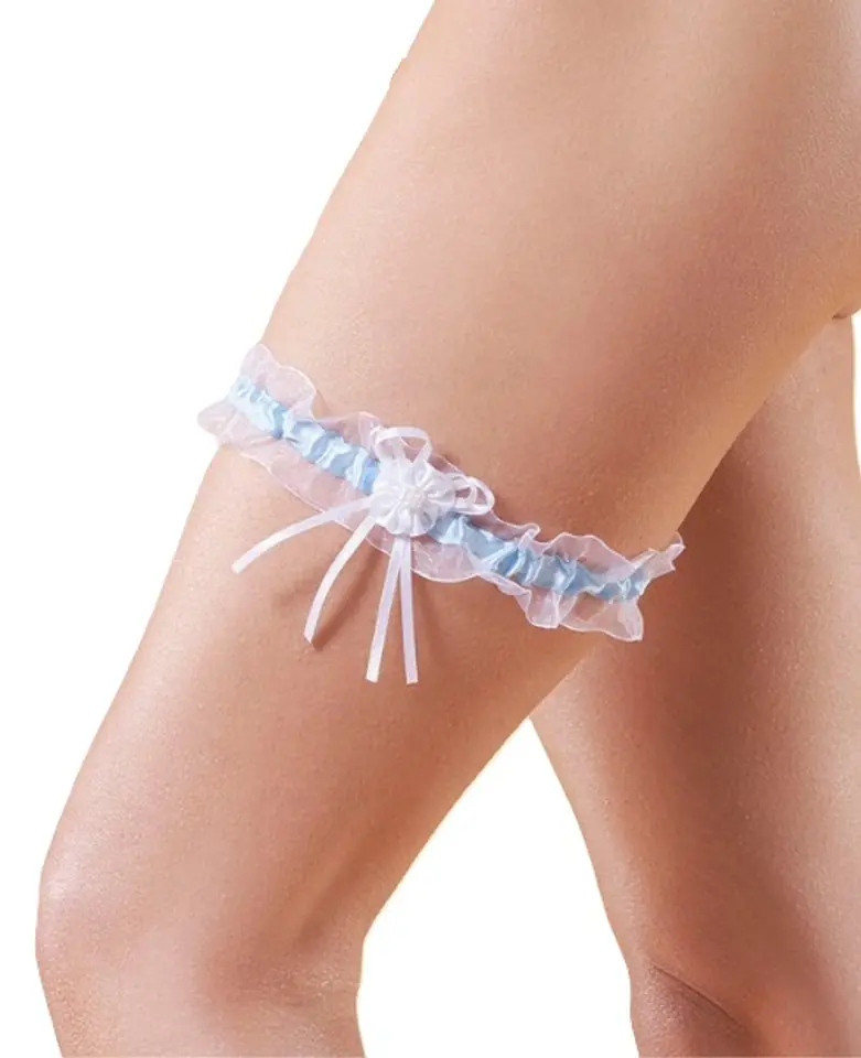 Elegancka podwiązka z delikatnego szyfonu i satynowej tasiemki, zdobiona kokardką z kwiatuszkiem. Elastyczna gumka pozwoli utrzymać ją na swoim miejscu.