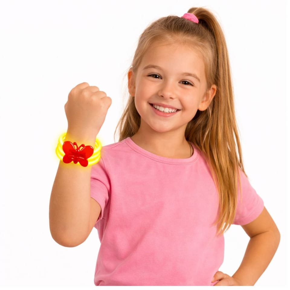 Fluorescencyjne patyczki tworzą wyraźny efekt świetlny, a plastikowy motylek pełni funkcję ozdobną oraz elementu łączącego, nadając całości wyjątkowego, lekkiego i atrakcyjnego wyglądu. Podwójna konstrukcja sprawia, że bransoletka prezentuje się bardziej efektownie i jest lepiej widoczna podczas użytkowania. Lekka i elastyczna forma zapewnia komfort noszenia zarówno dzieciom, jak i dorosłym.
