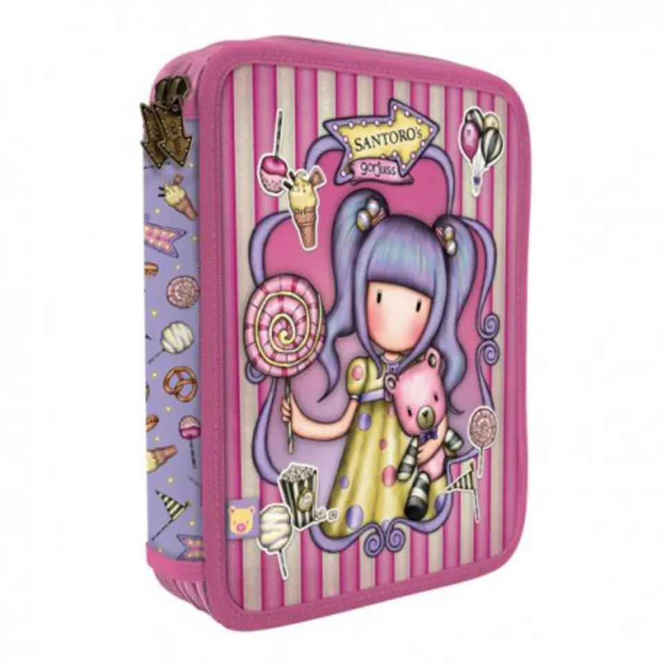 Podwójny Piórnik z Wyposażeniem - Gorjuss - First Prize Fantastyczna seria First Prize ozdobiona jest grafiką dziewczynki Gorjuss ze słodkim misiem, na tle w kolorze liliowym, wzbogacona akcesoriami z lunaparku: balonami, popcornem, lizakami, cukrową watą. Podwójny piórnik z wyposażeniem zawierający wszystko to, co potrzebne do szkoły. Pierwsza komora zawiera 2 ołówki HB, komplet 3 długopisów/ czerwony, niebieski, czarny / i 18 kredek, gumkę, oraz temperówkę. Druga komora wyposażona została w komplet 18 flamastrów, linijkę, ekierkę i kątomierz. Każdy element wyposażenia posiada logo Santoro. Wykonany ze szczególną dbałością. Wewnątrz posiada ciekawy wzór. Wspaniały na prezent. Wymiary: 23,5 cm x 19 cm x 4cm. Zabawna kolekcja Fairground pełna plecaków, akcesoriów i artykułów papierniczych, która nawiązuje do tajemniczych przygód przeżytych w Wesołym Miasteczku. Nie brak tu fajerwerków, karuzel, beczek śmiechu, huśtawek i zdobywanych nagród. Zabawne pompony, słodkie wzory, czy metalowe zawieszki przeniosą nas do barwnego świata Santoro, pełnego niespodzianek. To kolekcja, którą będziemy cenić przez wiele lat. Podążaj za dziewczynami, bohaterkami 4 serii: Up & Away, Fireworks, Carusel i First Prize i odkrywaj ekscytującą kolekcję pełną cudownych smakołyków! 688GJ22