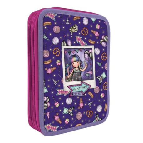 Podwójny Piórnik z Wyposażeniem - Gorjuss - Up and Away Fantastyczna seria Up and Away ozdobiona jest grafiką dziewczynki Gorjuss, utrzymana w kolorach głębokiego fioletu. Na odwrocie fajerwerki, kolorowe girlandy, cukrowa wata - wszystko co znajdziemy w wesołym lunaparku. Podwójny piórnik z wyposażeniem zawierający wszystko to, co potrzebne do szkoły. Pierwsza komora zawiera 2 ołówki HB, komplet 3 długopisów/ czerwony, niebieski, czarny / i 18 kredek, gumkę, oraz temperówkę. Druga komora wyposażona została w komplet 18 flamastrów, linijkę, ekierkę i kątomierz. Każdy element wyposażenia posiada logo Santoro. Wykonany ze szczególną dbałością. Wewnątrz posiada ciekawy wzór. Wspaniały na prezent. Wymiary: 23,5 cm x 19 cm x 4cm. Zabawna kolekcja Fairground pełna plecaków, akcesoriów i artykułów papierniczych, która nawiązuje do tajemniczych przygód przeżytych w Wesołym Miasteczku. Nie brak tu fajerwerków, karuzel, beczek śmiechu, huśtawek i zdobywanych nagród. Zabawne pompony, słodkie wzory, czy metalowe zawieszki przeniosą nas do barwnego świata Santoro, pełnego niespodzianek. To kolekcja, którą będziemy cenić przez wiele lat. Podążaj za dziewczynami, bohaterkami 4 serii: Up & Away, Fireworks, Carusel i First Prize i odkrywaj ekscytującą kolekcję pełną cudownych smakołyków! 688GJ24