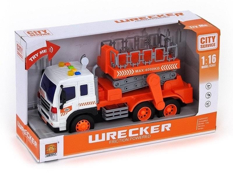 pojazd budowlany z podnośnikiem 1:16 (26cm), napęd na koło zamachowe, światło, dźwięk; 32x18,5x12cm, W/B