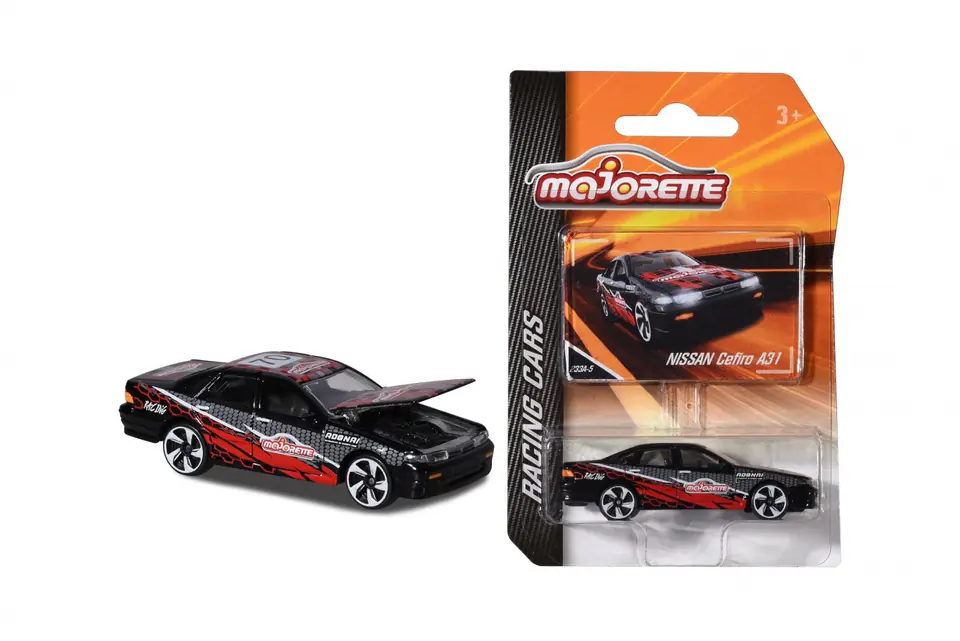 Metalowe modele samochodów wyścigowych, dostępne marki: Audi, Chevrolet, Citroen, Dacia, Dodge, Ford, Lamborghini, Mercedes-AMG, Mercedes-Benz, Opel, Porsche, Renault, Subaru, VW, ruchome elementy, karta kolekcjonera.