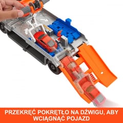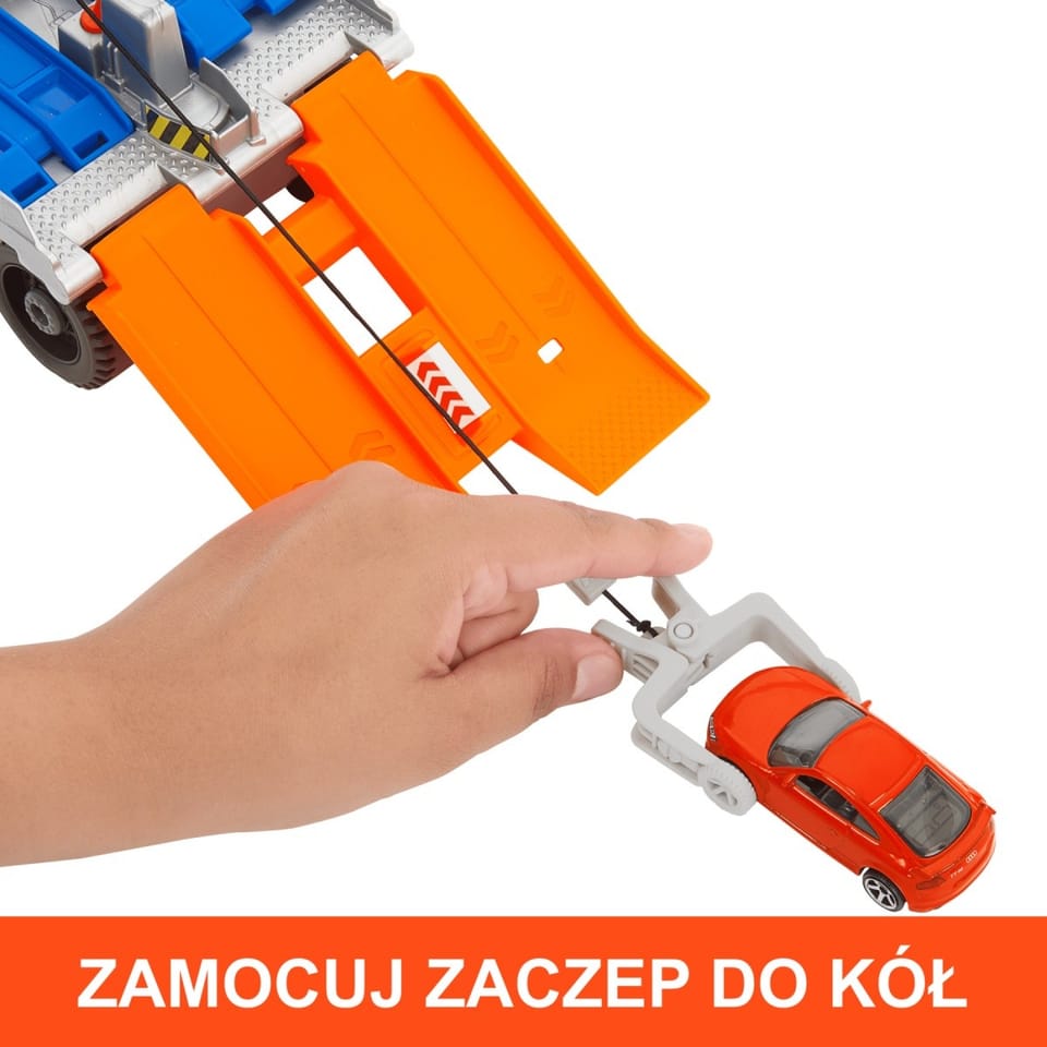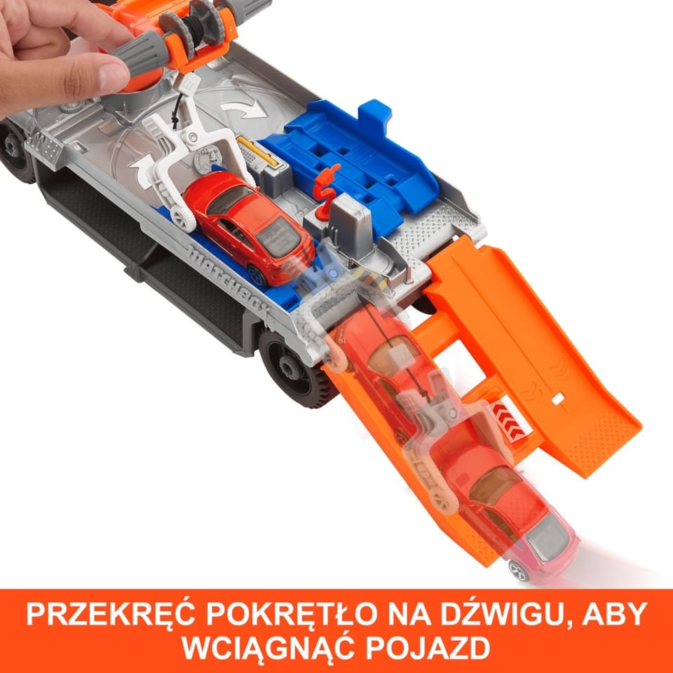 - Pojazd ma ruchomy dźwig, którym można unosić autka w skali 1:64 na lawetę do przeglądu. W zestawie jest jeden metalowy samochodzik Matchbox Audi TT RS Coupe. Dodatkowe pojazdy są sprzedawane oddzielnie.