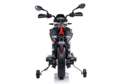 Czarny Motor Aprilia A007 cieszy oko osób w każdym wieku. Dzieci zdecydowanie docenią cechy designu upodabniające pojazd do prawdziwego, takie jak tylny błotnik z miejscem na tablicę rejestracyjną, lusterka boczne oraz, co najważniejsze, mało widoczne podporowe koła. Dzięki niewielkiemu rozmiarowi bocznych kółek nie rzucają się one w oczy, a dziecko wygląda jak prawdziwy motocyklista! Dorośli natomiast będą zachwycać się dbałością o detale w projekcie pojazdu. Silnik i elementy mechaniczne zostały wymodelowane w korpusie motocyklu, dzięki czemu wyglądają przekonująco i realistycznie. W oczy rzucają się szczegóły takie jak idealnie odwzorowane hamulce tarczowe, tylne amortyzatory, a także realistyczna, działająca przednia lampa LED.