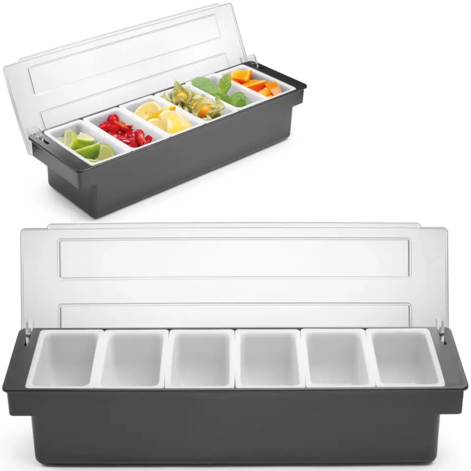Pojemnik barmański na dodatki do drinków marki HENDI idealnie nadaje się do użytku w barach, pubach i restauracjach. W obudowie z HIPS (polistyren wysokoudarowy) i przeźroczystej pokrywie z tworzywa ABS (Akrylonitryl-butadien-styren) można w estetyczny i praktyczny sposób przechowywać składniki do dekoracji koktajli. Obudowę, w której umieszczone są pojemniki, wykonano z trwałej, odpornej na korozję stali nierdzewnej. Każdy z pojemników można wygodnie wyjąć i umyć ręcznie lub w zmywarce.
