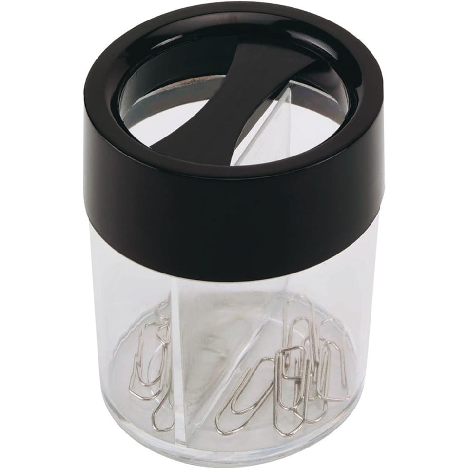 * wykonany z plastiku * górna czarna część z magnesem i okrągłym otworem do wyjmowania spinaczy * dolna część - transparentna * okrągły * rozmiar (wys. x śr.): 70x60mm * kolor transparentny czarny * 16 spinaczy GRATIS