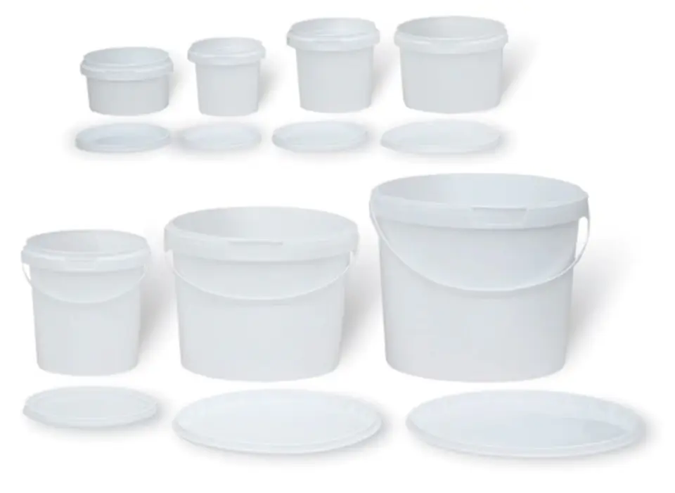 Praktyczne pojemniki plastikowe z przykrywką do mieszania i przechowywania farb i lakierów.