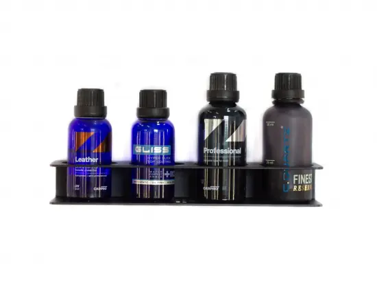 Cztery otwory, dwa o średnicy 45 mm i dwa o średnicy 35 mm pomieszczą większość dostepnych na rynku 30 ml i 50 ml butelek z powłokami. Wolnostojąca podstawka może być umieszczona w dowolnym miejscu blisko waszego stanowiska pracy lub bezpośrednio na waszym wózku detailingowym.