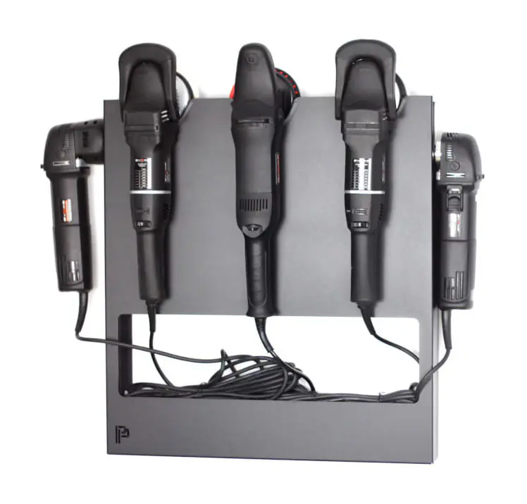 Nasz wieszak może bezpiecznie pomieścić trzy do pięciu maszyn polerskich, umiejętnie ukrywając ich kable w specjalnym schowku. Wykonany z wysokiej jakości wytrzymałej stali, precyzyjnie wycięty i wygięty, finalnie pokryty proszkowym wykończeniem, zarówno wewnątrz jak i zewnątrz, aby zapewnić dodatkową warstwę ochronną przed utlenianiem.