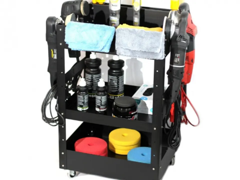 Rozszerzona o środkową półkę wersja wózka detailingowego.