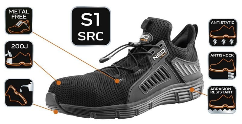 Półbuty robocze, S1, cholewka z tkanina typu mesh i pokrycie z gumy, dwumateriałowa podeszwa z EVA i gumy, kompozytowy podnosek, but w klasie S1 SRC (SRC- Odporność na poślizg na podłogach z płytek ceramicznych pokrytych roztworem laurylosiarczanu sodu (SLS) i stalowej podłogi pokrytej glicerolem), antypoślizgowa podeszwa zewnętrzna z systemem amortyzacji, odporna na ścieranie, oleje, benzynę i inne rozpuszczalniki organiczne, zamknięta część pięty, antyelektrostatyczna wkładka, ciekawy, modny wygląd, certyfikat CE, rozmiar 42