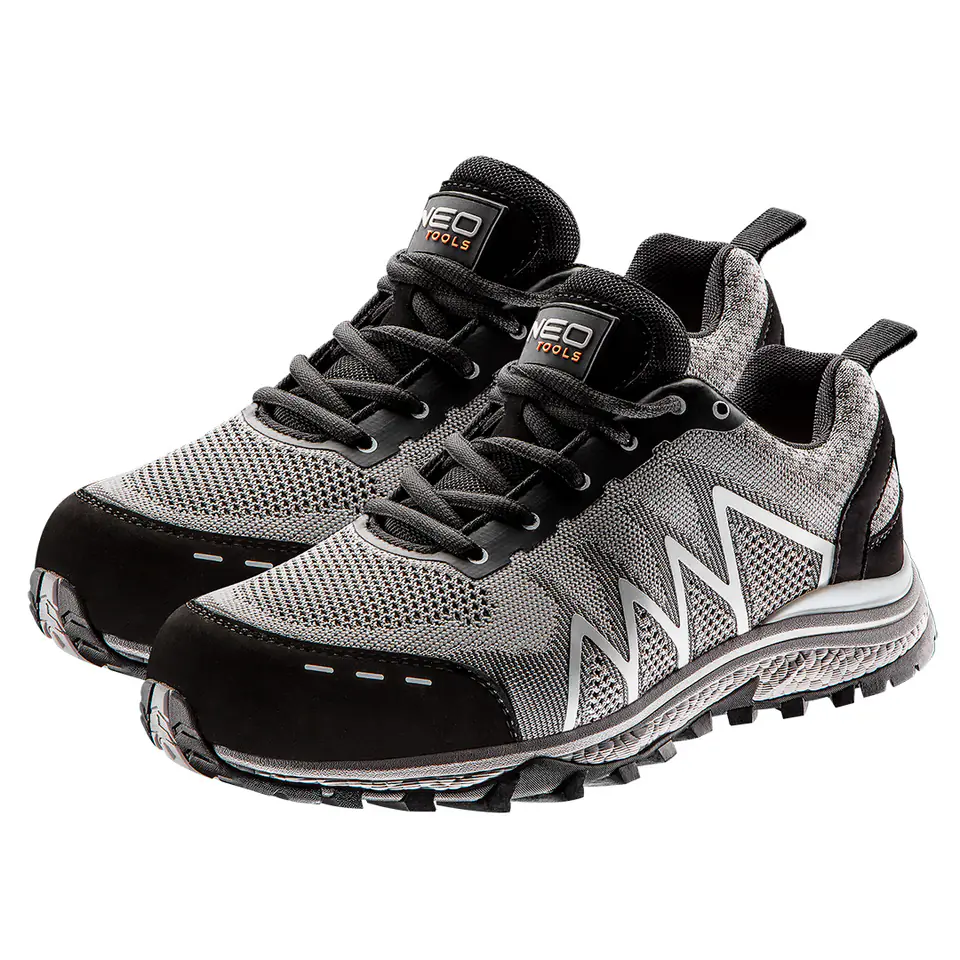 Półbuty zawodowe O1, bez metalu, rozmiar 42, materiałowa cholewka, siatkowe wykończenie wewnętrzne, podeszwa wykonana z gumy i pianki EVA wtryskiwana, lekkie, oddychające, wkładka antyelektrostatyczna, zabudowana pięta, absorbcja energii w części piętowej, odporność podeszwy na oleje, benzynę i inne rozpuszczalniki organiczne (węglowodory), spełnia wymagania normy EN ISO 20347:2012 SRA FO O1, SRA- odporność na poślizg na podłożu ceramicznym pokrytym roztworem laurylosiarczanu sodu (SLS), certyfikat CE