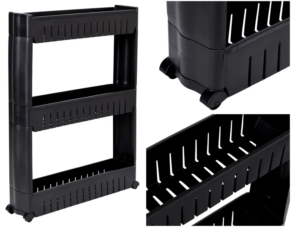 Półka kuchenna łazienkowa czarna 3 poziomy LeiraPrzeznaczenie: kuchnia, łazienka | Kolor: czarny Mobilna szafka idealna do wąskich przestrzeni, takich jak kuchnia czy łazienka. Jej modułowa konstrukcja wykonana z wytrzymałego tworzywa umożliwia łatwe dopasowanie do potrzeb – półki można dodawać lub odejmować. Dzięki kompaktowym wymiarom doskonale sprawdzi się między szafką a lodówką, pralką czy w innych trudno dostępnych miejscach. Regał kuchenny świetnie nadaje się do przechowywania przypraw, akcesoriów kuchennych, kosmetyków, środków czystości i wielu innych niezbędnych rzeczy. Mobilność zapewniają cztery kółka, dzięki którym szafka łazienkowa na kółkach łatwo przemieszcza się tam, gdzie jest potrzebna. Cechy produktuModułowa konstrukcja z możliwością dodawania lub zdejmowania półekTrzy pojemne poziomyMocne tworzywo sztuczneWyposażone w kółka dla łatwego przesuwaniaPrzeznaczone do wielu pomieszczeń - kuchnia, łazienka lub garderoba WymiarySzerokość: 54 cmGłębokość: 12,5 cmWysokość: 71 cm Informacje dodatkowePrzedstawione kolory należy traktować poglądowo - mogą odbiegać od rzeczywistych ze względu na różne ustawienia monitorów oraz proces obróbki zdjęć. Rzeczywiste wymiary mogą się różnić od podanych wyżej. Tolerancja błędów może wynosić +/- 5%. Marka:GockowiakKod EAN:5902340321539Kolor:czarnyWysokość:71 cmSzerokość:54 cmGłębokość:12,5 cmIlość półek:trzy