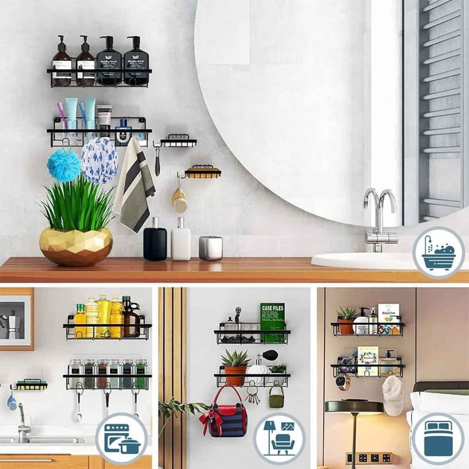- UNIWERSALNE - Na półkach można przechowywać różne produkty i akcesoria do pielęgnacji, takie jak żel pod prysznic, szampon, kosmetyki, gąbki czy szczotki. Dodatkowo, półki posiadają wieszaki, na których możemy zawiesić gąbkę, szczotkę lub inne akcesoria. Duże półki wyposażone są w trzy wieszaki, a małe w dwa. Półki można również wykorzystać w kuchni jako półki na przyprawy.