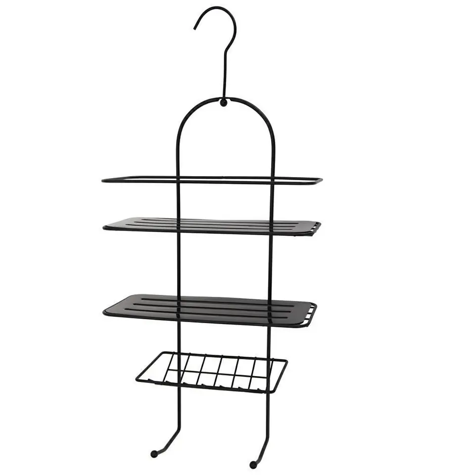 Wieszak łazienkowy z dwiema półkami oraz koszyczkiem zawieszany na ruchomym haczyku. Idealnie sprawdzi się w kabinie czy też baterii prysznicowej. Całość wykonana z metalu malowanego proszkowo oraz czarnej pleksi. Wyposażony w otwory odprowadzające wodę. Prosty i nowoczesny design pasujący do każdego stylu łazienki.Specyfikacja:- malowana proszkowo– odporna na rdzewienie- bez wiercenia dziur- wysokość całkowita: 55 cm- wysokość bez haka: 46 cm- głębokość: 11 cm