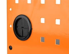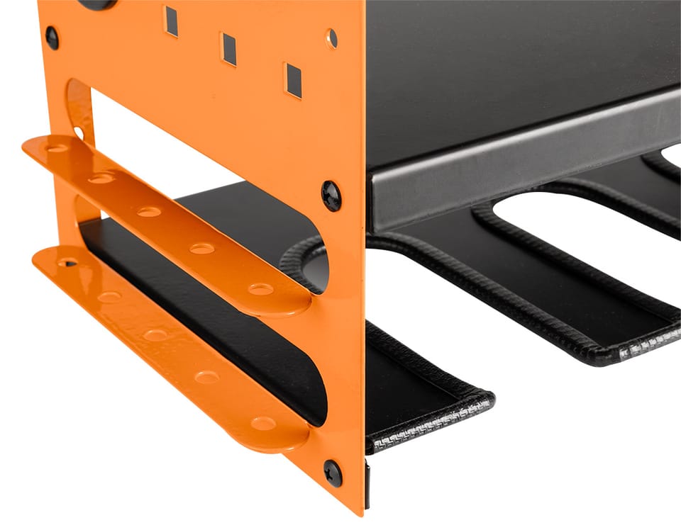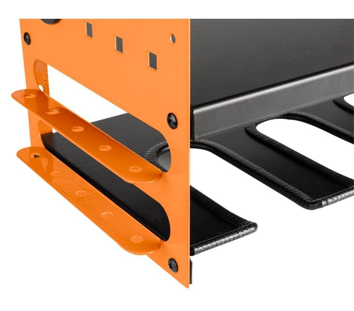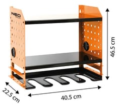 Półka na elektronarzędzia akumulatorowe, max udźwig 20 kg, waga 6,5 kg, wymiary: 465 x 405 x 225 mm, materiał: blacha stalowa 1,5 mm + malowanie proszkowe, perforacja blachy: 10 x 10 mm, otwory w bocznych ściankach: 38 mm