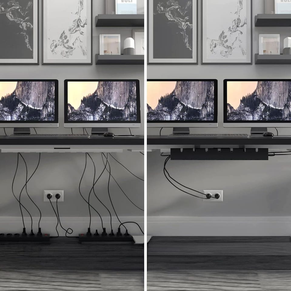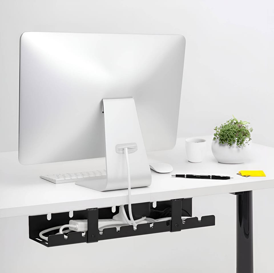 Półka na kable pod biurko Almada 50 cmKolor: czarnyMontaż: na wkręty Półka na kable pod biurko Almada to nowoczesne i eleganckie rozwiązanie, które pomoże Ci uporządkować i zabezpieczyć kable na Twoim stanowisku pracy. Wykonana z wysokiej jakości stali malowanej proszkowo w kolorze czarnym matowym, gwarantuje trwałość i estetykę na lata. Dzięki prostemu sposobowi montażu, przykręcanemu do blatu na cztery wkręty, instalacja jest szybka i bezproblemowa. Półka posiada otwory na kable, które nie tylko ułatwiają organizację, ale również zapewniają lepszą wentylację dla urządzeń elektronicznych, dzięki podstawie z wieloma otworami. W zestawie znajduje się komplet montażowy, co czyni ten produkt gotowym do natychmiastowego użycia. Z półką na kable Almada, bałagan z kablami pod biurkiem stanie się przeszłością. Wymiary produktu to szerokość 50 cm, wysokość 11 cm oraz głębokość 12 cm, co pozwala na łatwe dopasowanie do większości biurek. ➡️ Cechy Produktu✅ Materiał: Stal malowana proszkowo, gwarantująca trwałość i odporność na zarysowania.✅ Kolor: Czarny matowy, łatwo wpasowujący się w każde wnętrze.✅ Sposób montażu: Przykręcana do blatu na 4 wkręty, zapewniająca stabilność i bezpieczeństwo.✅ Otwory na kable: Ułatwiają organizację i dostęp do kabli.✅ Podstawa z wieloma otworami: Dla lepszej wentylacji urządzeń.✅ Zestaw montażowy: W komplecie, dla łatwej i szybkiej instalacji.✅ Wymiary: Szerokość 50 cm, wysokość 11 cm, głębokość 12 cm. ➡️ Specyfikacja produktu:Materiał: Stal malowana proszkowoKolor: Czarny matowyMontaż: Przykręcany na 4 wkrętyOtwory na kable: TakWentylacja: Podstawa z wieloma otworamiZestaw montażowy: Tak➡️ Wymiary:Wysokość całkowita: 11 cmSzerokość: 50 cmGłębokość: 12 cm ⭐ Zalety organizera na kable:✅ Maskuje i zabezpiecza kable: Chroni przed dziećmi i zwierzętami, zapobiegając przypadkowemu odłączeniu.✅ Ułatwia kontrolę nad kablami: Oszczędza miejsce, utrzymując porządek wokół stanowiska pracy.✅ Zapewnia porządek: Eliminuje bałagan pod i za biurkiem.✅ Ochrona przed przypadkowym odłączeniem: Zapobiega wypięciu kabli nogą.✅ Optymalna organizacja kabli: Prowadnica umożliwia łatwą organizację i rozłożenie kabli.✅ Otwarta konstrukcja: Gwarantuje cyrkulację powietrza, zapewniając lepsze warunki dla urządzeń. UWAGA | Przedstawione kolory należy traktować poglądowo - mogą odbiegać od rzeczywistych ze względu na różne ustawienia monitorów oraz proces obróbki zdjęć. • Rzeczywiste wymiary mogą się różnić od podanych w opisie. Tolerancja błędów może wynosić +/- 2 cm.